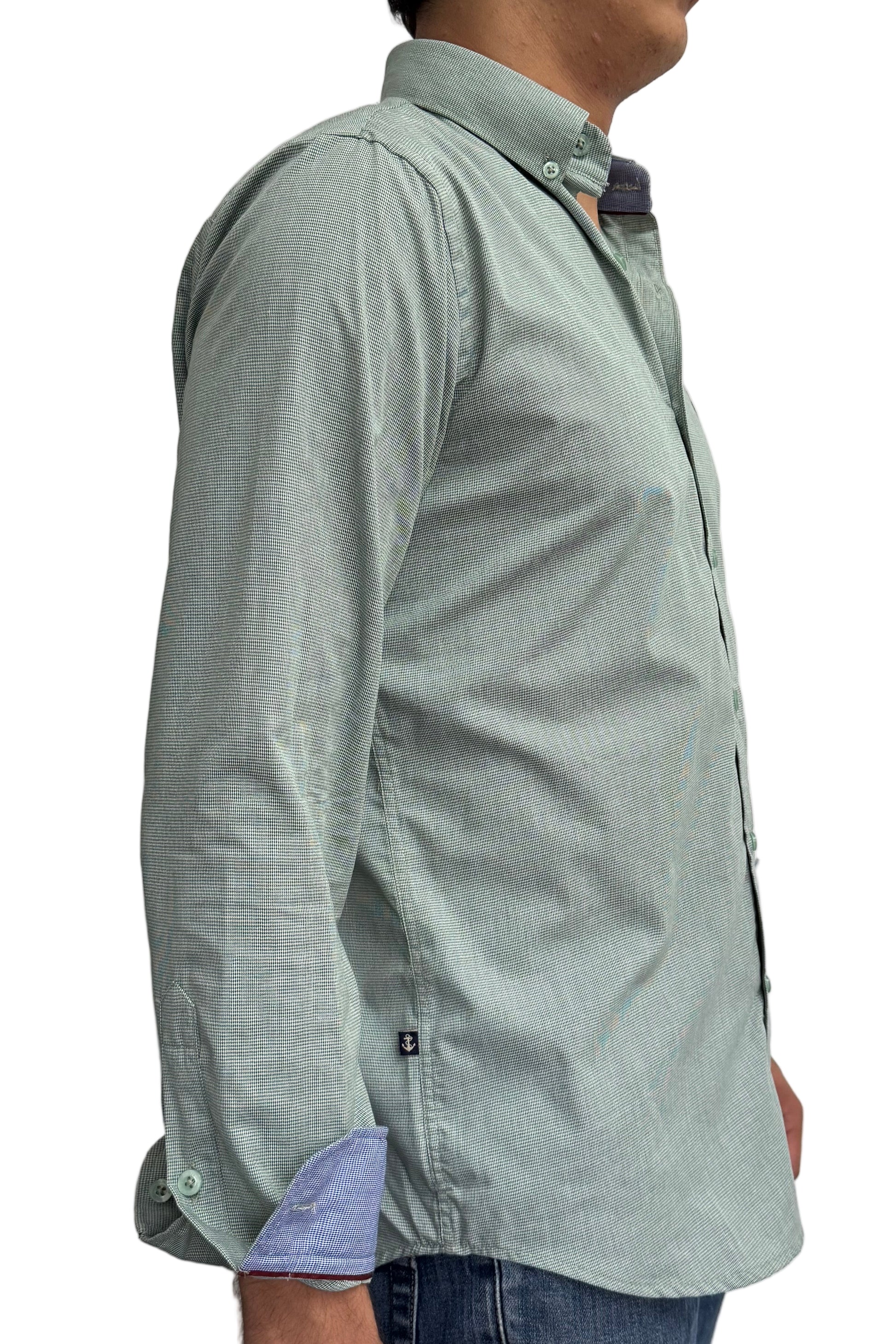 Esta camisa en algodón presenta un elegante diseño punteado verde, complementado con detalles en contraste azul en los puños y el cuello. Confeccionada en algodón de alta calidad, ofrece comodidad y transpirabilidad, ideal para un uso prolongado. Su combinación de colores aporta un toque moderno y sofisticado a cualquier atuendo, perfecta para ocasiones formales o casuales.