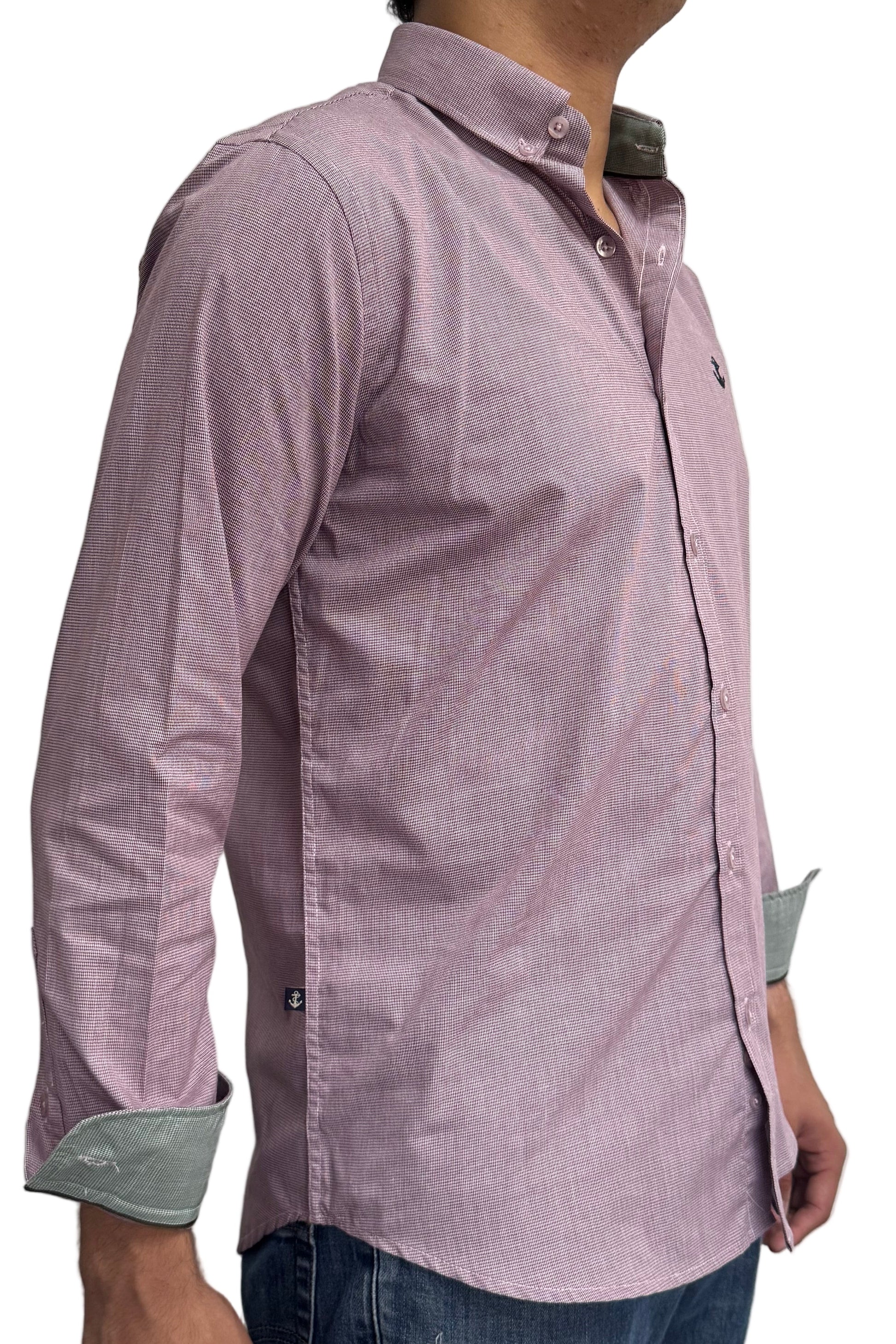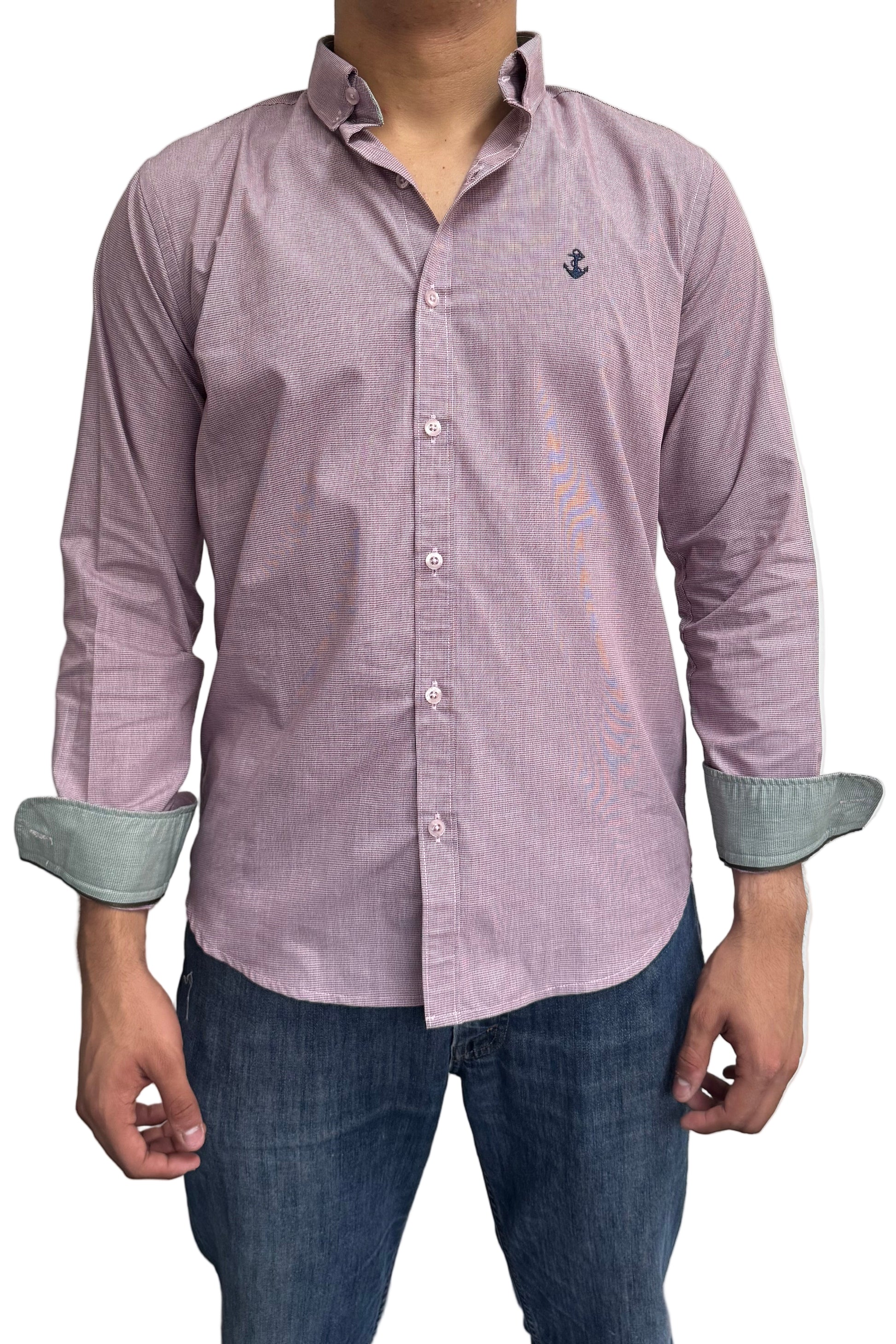 Esta camisa de algodón presenta un elegante punteado en color vino, combinado con cuello y puños en contraste verde que añaden un toque distintivo y sofisticado. Su diseño cuidadoso ofrece comodidad y estilo, ideal para quienes buscan una prenda versátil que resalte en cualquier ocasión.