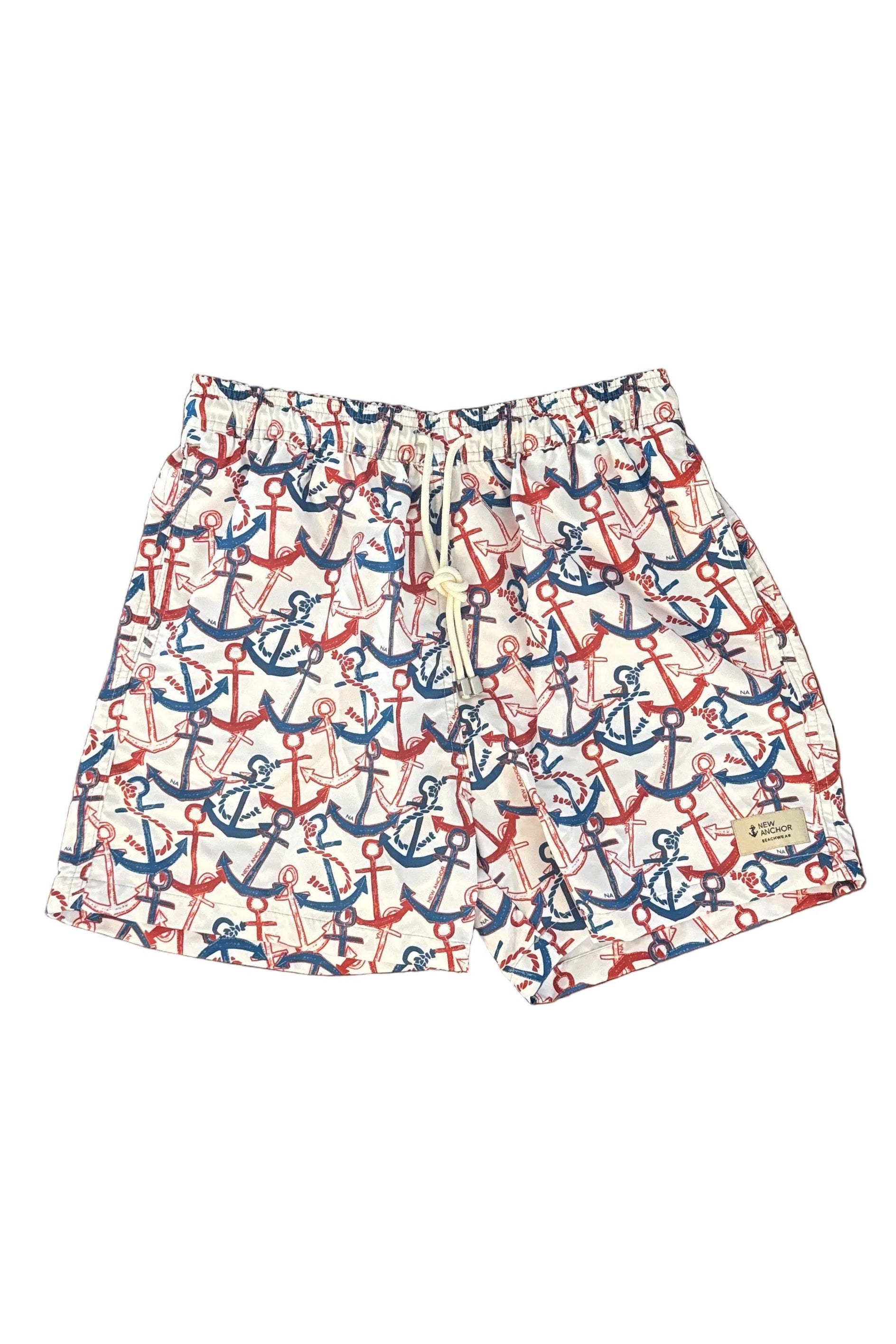 Pantaloneta de baño de niño en blanco con diseño de anclas en tonos rojo y azul. Confeccionada con forro de malla de secado rápido, cuenta con cintura ajustable mediante cordón y bolsillos funcionales forrados en malla. Ideal para actividades acuáticas con comodidad y durabilidad.